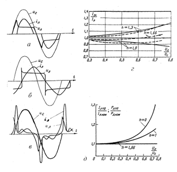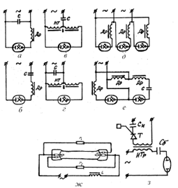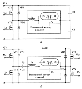 Все эти схемы (рис. 27) выполняют одновременно три функци: выпрямление переменного напряжения сетевой частоты (на схемах для простоты не показаны); преобразование постоянного напряжения в переменное напряжение повышенной частоты (1÷10 кГц); стабилизацию режима работы лампы с помощью конденсаторов и магнитных элементов. При работе лампы в схемах с повышенной частотой становится выгодным применение ёмкостного балласта. Если на частоте 50 Гц в среднем на каждый 1% изменения напряжения в сети при индуктивном балласте происходит изменение тока, мощности светового потока в среднем на 2%, а при ёмкостном балласте, при той же частоте, величине и характере изменения Uc параметры изменяются в среднем только на 1%.