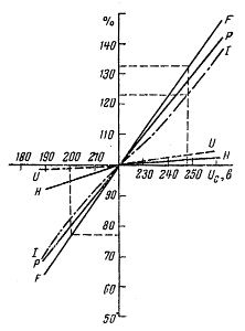 Характеристики ламп ДРЛ показывают (рис.7), что при изменении уровня напряжения в пределах ± 10% они изменяются практически прямолинейно и могут быть аппроксимированы следующими линейными уравнениями: