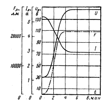 1 – ток лампы; 2 – мощность лампы; 3 – световой поток;
