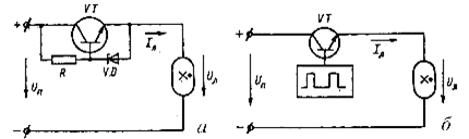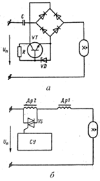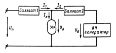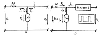 Индуктивность в цепи постоянного тока не создает падение напряжения и не входит в величину Lб , выполняя лишь роль сглаживающего фильтра. В перерывах между импульсами от Сб , питание лампы осуществляется за счет энергии дросселя через обратный диод. Можно предположить, что объединение переменного и постоянного источников в одну схему позволяют повысить надежность и согласовать нагрузку лампы при различных режимах ее работы. Относительно простые элементы схемы (диоды, конденсаторы, терморезисторы и другие), создающие постоянную составляющую на лампе и вводящие обратные управляющие связи (по току, по температуре, по емкости цепи), преобразуют лишь небольшую часть энергии и их влияние на технико-экономические показатели всей системы незначительны.
