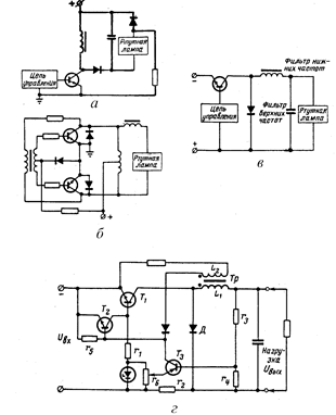 Для преобразования частоты наиболее перспективны электронные преобразователи на полупроводниковой основе, к.п.д. которых достигает 0,92÷0,94. На рис. 27 показаны схемы дроссельного преобразователя (а) и двухтактного преобразователя (б), а также коммутационные регуляторы (в,г).