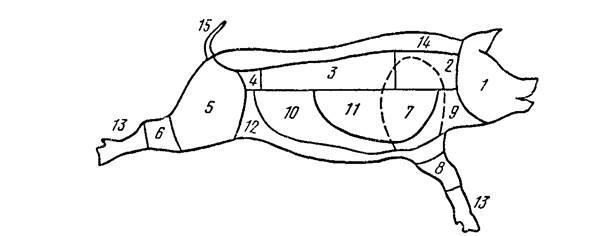 Мясо свинина должна быть заморожена до температуры в толще мышц (у кости) не выше минус 10 °С. 1.4. Свинину выпускают в шкуре, без головы, ног, хвоста, внутренних органов, внутреннего жира и без баков (щечное мясо), отделенных вместе с шейным зарезом от туши по прямой линии непосредственно впереди первого шейного позвонка. Вырезка оставляется при туше. Свинина в шкуре должна быть обработана путем шпарки и опалки.