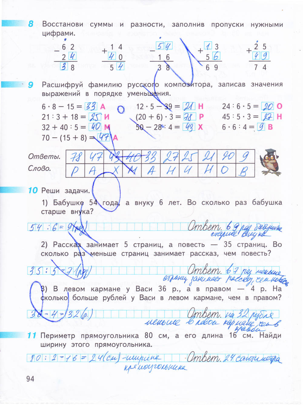 Главная / Готовые домашние задания (ГДЗ) / 3 класс / Математика / Дорофеев Г. В., Миракова Т. Н., Бука Т. Б. / задание: стр. 94