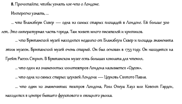 Главная / Готовые домашние задания (ГДЗ) / 4 класс / Английский язык / Афанасьева, Верещагина / ГОРОДСКАЯ ЖИЗНЬ. ЛОНДОН, Урок 24 Задача: 8
