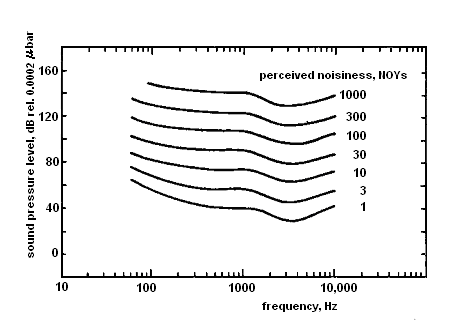 The perceived noisiness of an aircraft flyover depends on the frequency content, relative to the ear’s response, and on the duration. The perceived noisiness is measured in NOYs (unit of perceived noisiness) and is plotted as a function of sound pressure level and frequency for random noise in Fig. 4.1.