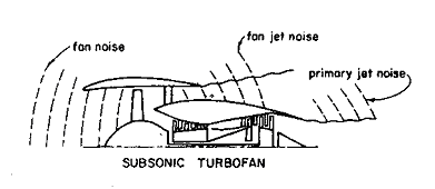 The introduction of the turbofan engine, with its lower jet velocity, temporarily alleviated the jet noise problem but increased the high-frequency turbomachinery noise, which became a severe problem on landing approach as well as on take-off. This noise was reduced somewhat by choosing proper rotor and stator blade numbers and spacing and by using engines of the single-mixed-jet type.