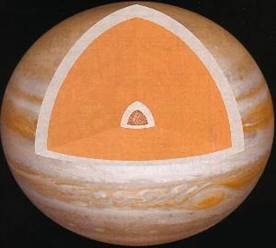 Слой металлического водорода толщиной, согласно теоретическим моделям, около 30-50 тыс. км. Протоны и электроны в нём существуют раздельно, и он является хорошим проводником электричества. Последние эксперименты показали, что водород не изменяет свою фазу внезапно, следовательно, внутренности Юпитера не имеют четких границ между слоями. Ученые полагают, что Юпитер имеет твердое ядро, состоящее из тяжёлых элементов (более тяжёлых, чем гелий). Его размеры — 15—30 тыс. км в диаметре, ядро обладает высокой плотностью. Если даже на Юпитере и имеется твердая поверхность, то стоять на ней нельзя без опасения быть раздавленным весом выше лежащей атмосферы. По теоретическим расчетам, температура ядра планеты около 30 000°С, а давление 30-100 млн. атмосфер. Такие условия недостаточны для термоядерных реакций, но Юпитер излучает в пространство примерно в 2 раза больше энергии, чем получает ее от Солнца. Наиболее вероятно, что избыточное тепловое излучение планеты является результатам гравитационного сжатия планеты, которое продолжается и сейчас. Тепло перемещается через толщу атмосферы и просачивается наружу через свободные от облаков области, которые соответственно названы «горячими пятнами». Мощные электротоки, возникающие в слое металлического водорода, порождают гигантское магнитное поле Юпитера. Если бы можно было увидеть свечение магнитосферы Юпитера, взаимодействующей с солнечным ветром из электронов и протонов, то на нашем небе вокруг Юпитера появилась бы медузообразная структура крупнее Луны.