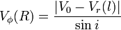 Скорость, получившаяся после учёта скорости движения галактики как целого, — скорость по лучу зрения (Vr ), и чтобы вычислить скорость вращения галактики на данном расстоянии, необходимо учесть эффекты проекции. Для этого необходимо знать угол наклона оси галактики к лучу зрения i, а также угол φ между большой осью галактики и прямой, проходящей через центр галактики и наблюдаемую точку. Таким образом, чтобы перейти от Vr к Vφ , необходимо знать пять параметров: скорость движения галактики V0 , углы i и φ, две координаты центра галактики (относительно любой точки изображения).