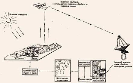 Сцена - это то, что находится перед датчиком; построение геологической модели сцены является в самом общем виде той целью, ради которой создается система. Изучение сцены на расстоянии возможно благодаря тому, что она обнаруживает себя в физических полях, которые могут быть измерены. Наиболее часто используются излученные или отраженные электромагнитные волны, в последнем случае необходим источник освещения , пассивный (например. Солнце) или активный (лазеры, радиолокаторы и др.). Физические поля измеряются датчиками , входящими в состав высотного комплекса , который кроме измерений служит для первичной обработки и передачи данных на Землю. Данные, закодированные в электромагнитном сигнале или записанные на твердотельные носители (фотопленки, магнитные ленты и пр.), доставляются в наземный комплекс , в котором происходит их прием, обработка, регистрация и хранение. После обработки данные обычно переписываются в кадровую форму и выдаются в качестве материалов дистанционного зондирования , которые по традиции называются космическими снимками. Пользователь , опираясь на внешнюю базу знаний, а также собственный опыт, интуицию, проводит анализ и интерпретацию материалов ДЗ и создает геологическую модель сцены, которая и является формой регистрации решения поставленной проблемы. Достоверность модели проверяется сопоставлением, или идентификацией модели и сцены; идентификация замыкает систему и делает ее пригодной для прикладного пользования.
