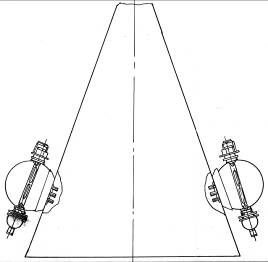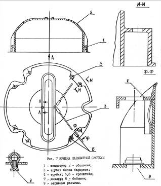 Крышка парашютной системы (рис.7) состоит из шпангоута I и оболочки 2, сваренных встык. В полюсной части крышки имеется щель, через которую проходит хвостовик переходника корпуса центральной части. На наружной поверхности крышки установлены трубки 3 блока барореле и приварены кронштейны 6, предназначенные для крепления отрывных разъемов 9. С внутренней стороны крышки к оболочке приварены кронштейны 5, служащие для крепления тормозного парашюта. Жиклеры 7 связывают полость парашютного отсека с атмосферой.