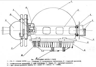 На спускаемой капсуле с помощью стяжных отстреливаемых лент (рис.2) установлены две платформы 3, 4 c пневмоагрегатом стабилизации СК 5, тормозным двигателем 6 и телеметрической аппаратурой 7.
