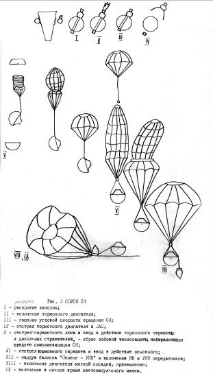 - отстрел крышки парашютной системы, ввод в действие тормозного парашюта и дипольных отражателей, сброс лобовой теплозащиты (для уменьшения массы СК);