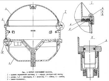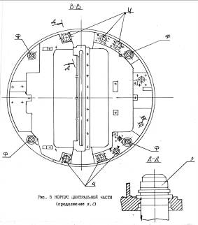 Днище (рис.6) состоит из шпангоута I и сферической оболочки 2, сваренных между собой встык. В шпангоуте имеются две кольцевые канавки для резиновых прокладок, отверстия "А" для соединения днища о корпусом центральной части, три бобышки "К" о глухими резьбовыми отверстиями, предназначенный для такелажных работ о СК. Для проверки герметичности СК в шпангоуте выполнено резьбовое отверстие с установленной в него заглушкой 6. В центре оболочки 2 с помощью винтов 5 закреплен штуцер 3, служащий для проведения гидропневмоиспытаний СК на заводе-изготовителе.