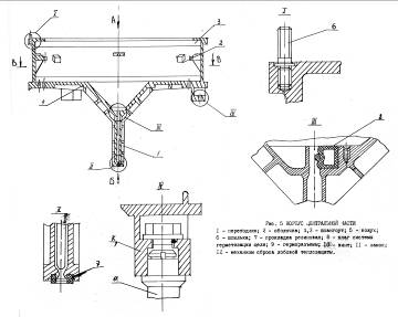 Переходник I изготовлен из двух частей, сваренных встык. На торцевой поверхности переходника имеется канавка для резиновой прокладки 7, на боковой поверхности - бобышки с глухими резьбовыми отверстиями, предназначенными для установки парашютной системы. Шпангоут 3 служит для соединения корпуса центральной части с днищем при помощи шпилек 6 и для крепления приборной рамы.