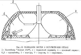 В негерметичном отсеке (рис.10) размещены: парашютная система, состоящая из основного 4 и тормозного 2 парашютов, дипольные отражатели и контейнер "Пеленг УКВ" I. Контейнер I установлен в чехле и соединен с корпусом СК тросом и привязанным к нему кабелем.