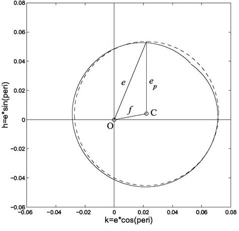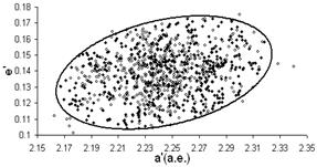 Усредненные результаты численного интегрирования элементов орбиты астероида можно представить как сумму “свободных колебаний” и “вынужденной” компоненты, обусловленной планетными возмущениями. На рис.1 показано сглаженное изменение эксцентриситета орбиты астероида e за 20000 лет, которое равно векторной сумме “вынужденного” эксцентриситета f и постоянного “собственного” эксцентриситета ep . Аналогично в осях q=sin(i )cos(Ω), p=sin(i )cos(Ω) определяется “собственное” наклонение орбиты sin(ip ). А “усредненное” по времени значение большой полуоси принимается за “собственную” полуось ap .