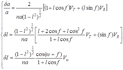 Восстановление поля скоростей осколков, образовавшихся при образовании семейства . Структура семейств в пространстве собственных элементов используется, чтобы получить информацию относительно скоростей выброса фрагментов в формирующих семейства событиях. Мы можем интерпретировать различия в орбитальных элементах в терминах различий в скорости выброса из первоначального родительского тела. Преобразования скоростей в орбитальные элементы или наоборот даются Гауссовыми формулами, которые могут быть записаны следующим образом, согласно предположению, применимому для семейств, что скорости выброса являются намного меньшими, чем орбитальная скорость родительского тела.