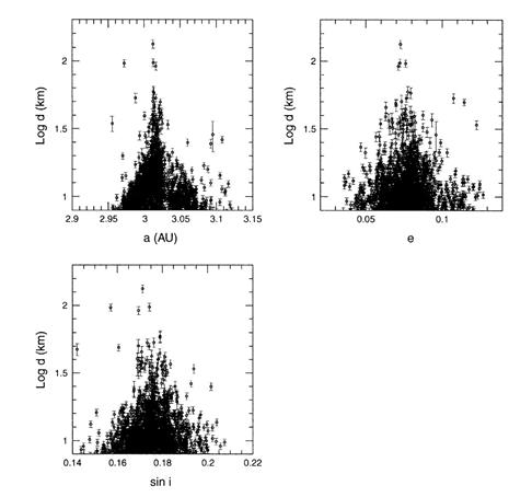 лет, а для малых тел оно существенно меньше. Столкновения не только изменяют распределение по размерам членов семейств, но также и производят эрозию в пространстве собственных орбитальных элементов, ведя к прогрессивному исчезновению семейств как распознаваемых группировок (Марзани и др. 1999) [5]. Однако недавно обнаруженная характерная “треугольная” зависимость значения собственных элементов от диаметра астероидов-членов семейства видимо подтверждает их взрывное происхождение и медленное старение семейств – диапазон разброса для всех собственных элементов уменьшается с ростом диаметра астероидов-осколков (рис. 2).
