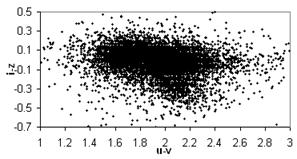 Мы пользуемся показателями цвета (color-index), скомбинированными из измерений в полосах u, g, r, i, z, и не показывают какой-либо линейной зависимости (сильной взаимной корреляции, то есть, точки распределяются по всему полю графика с возможными сгущениями).