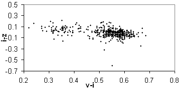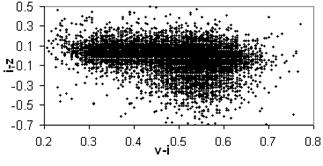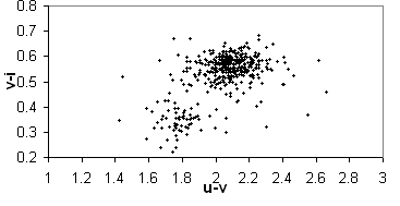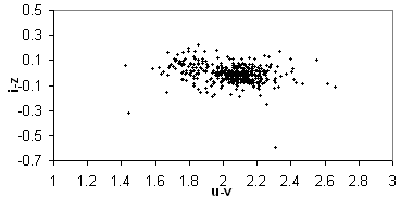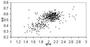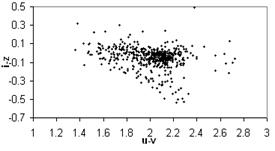 Мы выбрали три показателя цвета, которые подходят под эти критерии –(i-z), (u-v) и (v-i), где v=(u+g)/2, и рассматриваем трехмерную цветовую диаграмму. Поскольку 3-мерную диаграмму изображать не удобно, поэтому мы представим ее в 3-х проекциях: i-z (u-v); v-i (u-v); i-z (v-i) . (Рис.2.1)