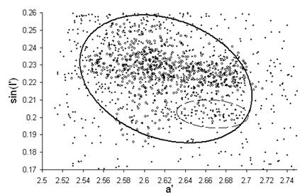 На цветовой диаграммевидим разделение на два облака точек. Предполагаем, что большее – это и есть найвероятнишие новые члены семейства Flora, а меньшее – подсемейство или вторичное дробление. Чтобы это проверить, мы меньшее сгущение рассмотрим в собственных элементах, например на графике sini’ (a’).