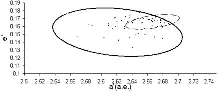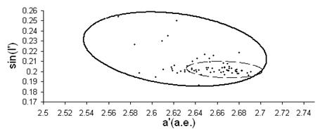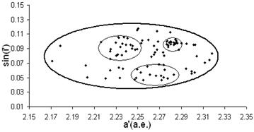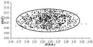Рис.2.8 Астероиды из рисунка 2.7 удовлетворяющие условие a’(2,273:2,89) sini’(0,091:0.103).