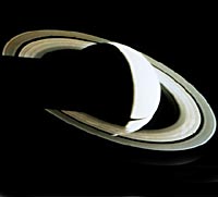 Вояджер 1 снял Сатурн через 4 дня после пролета планеты, 16 ноября 1980 г., c расстояния 5.3 млн. км. Перспектива планеты и колец уникальна - ее можно наблюдать, только находясь за орбитой Сатурна. Несколько спицеобразных деталей колец видны на этом снимке как светлые пятна. Тень Сатурна падает на кольца, яркий полумесяц планеты виден через все кольца, кроме самых плотных частей.