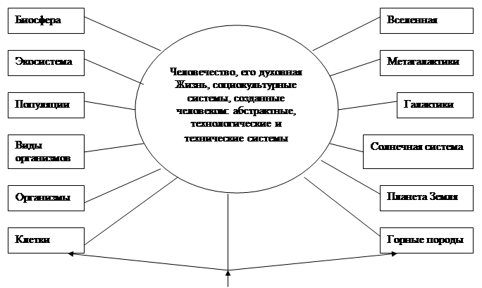 «С точки зрения системного подхода Мироздание – это грандиозная суперсистема, состоящая из множества иерархически взаимосвязанных подсистем разной природы и разного уровня сложности (космические, физические, химические, геологические, биологические, психологические, политические, экономические и т.д.), находящихся в разного рода отношениях и связях друг с другом и образующих определенную целостность»1 . Схематично она представлена на Рисунке №2. В ней выделены иерархии живой и неживой природы и социальные системы.