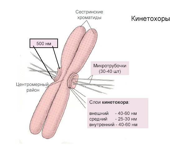 В прометафазе происходит следующее. На центромере каждой из хроматид формируется определенная структура, называемая кинетохор (см. рис. ниже). Он состоит, как вы, наверное, догадались, из определенных белков. Подчеркнем, что каждая хромосома несет два кинетохора, по одному – на каждую из своих хроматид. Каждый кинетохор связывается с растущими концами микротрубочек, отходящих от полюсов клетки. К каждому кинетохору прикрепляется несколько десятков микротрубочек (но вот у дрожжей – только одна).