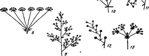 8 - сложный зонтик; 9 - метелка; циммозные соцветия: 12 - извилина; 13 - плейохазий.