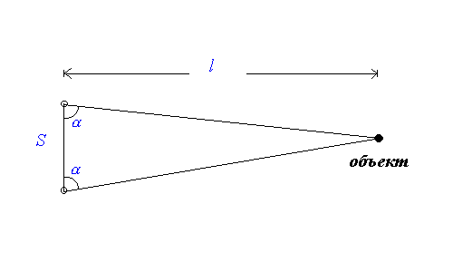 Известно расстояние между глазами S и угол между векторами направленности a. Расстояние l – мозг вычисляет мгновенно.