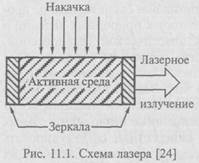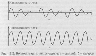 Пример 3. Процессы, происходящие в твердотельном лазере - оптическом лазерном генераторе (хотя лазерная генерация обнаружена и в межзвездном пространстве). Он представляет собой твердый стержень, в который внедрены атомы определенного типа - активная среда (рис. 11.1); на торцах стержня установлены зеркала. Каждый атом может возбуждаться действием извне, например с помощью света. После этого атом действует как микроскопическая антенна, испуская цуг световых волн длиной около 3 м. Процесс излучения длится обычно 10-8 с. Зеркала служат для селекции таких цугов: бегущие в аксиальном направлении цуги отражаются несколько раз от зеркал и остаются в лазере более продолжительное время, остальные быстро покидают объем. С увеличением входной мощности (накачка лазера) происходит следующее. При малых мощностях накачки лазер работает как лампа: атомные антенны излучают световые цуги независимо друг от друга (хаотично). При мощности накачки, равной пороговой мощности лазерной генерации, имеет место совершенно иное явление. Атомные антенны осциллируют в фазе, испуская один гигантский цуг (рис. 11.2).