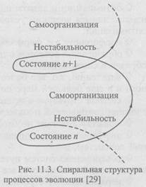 Каждый парциальный (частный) эволюционный процесс переводит систему в новую, в определенном смысле более высокую эволюционную плоскость, а процесс в целом обладает спиральной структурой (рис. 11.3). Анализ действующих и определяющих последовательность состояний системы условий, сил и механизмов необходим для разработки теории эволюции. Окончательные ответы пока получить не удается.