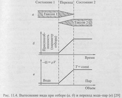 Одна из существенных черт глобальной эволюции - подобие явлений в системах, на первый взгляд совершенно различных. Например, обнаружена аналогия качественных переходов при эволюционных процессах с фазовыми переходами в термодинамике. Проиллюстрировать это положение можно на примерах из физики и экологии (рис. 11.4 и 11.5). Пусть биологические виды занимают на определенной территории одну экологическую нишу. При появлении нового вида, который существенно лучше использует ту же нишу, наступает фаза перехода от сосуществования к полному вытеснению исходных видов (рис. 11.4, а, б). Отметим общие свойства такого рода процессов: состояния 1 и 2 разделены переходной областью конечной величины; в переходной области состояния (виды) отличимы друг от друга; симметрия относительно использования видами экологической ниши не должна нарушаться; скачкообразный переход может быть обойден, например, с помощью медленного улучшения селекционной ценности таксона 1 до ценности таксона 2. Аналогичными свойствами характеризуется и такой, например, термодинамический фазовый переход, как переход вода - пар. На рис. 11.4, в для сравнения представлен график изменения термодинамического потенциала -Ω = pV функции объема.
