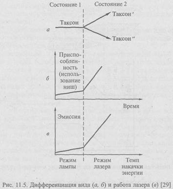 Другой существенный для эволюции процесс - специализация, дифференциация или распределение функций (рис. 11.5, а). Например, такой процесс реализуется, когда один вид использует две экологические ниши, но в ходе эволюции одна часть вида специализируется по отношению к одной нише, Другая часть - к другой, пока не образуются два различных вида. Поскольку при этом ресурсы обеих ниш используются с разделением функций, становится возможным быстрое улучшение приспособленности (рис. 11.5, б). В подобных случаях удается установить следующие свойства: переход происходит в определенной точке, отмечаемой прекращением образования смешанного потомства; с наступлением перехода нарушается симметрия использования ниш подвидами; в точке перехода оба состояния совпадают. Такой переход аналогичен кинетическому переходу, например, как в лазере (рис. 11.5, в).