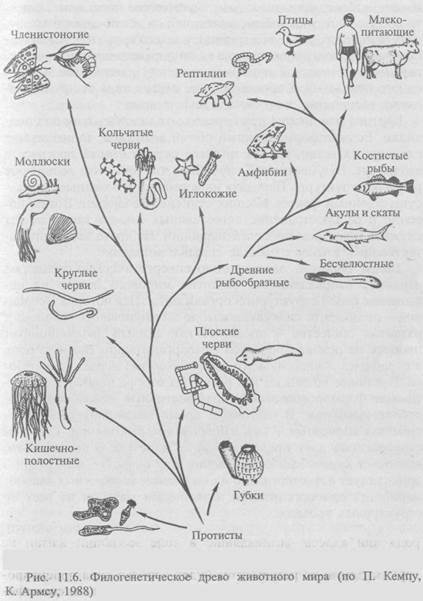 Обратимся к рис. 11.6. На нем отмечена еще одна существенная особенность процессов эволюции - ветвление. Наглядное описание этого свойства дает теория графов. Например, если вершинам графа поставить в соответствие виды некоего рода или класса, возникавшие в ходе эволюции жизни на Земле, и соединить ребрами (стрелками) виды, произошедшие друг от друга, то результатом будет особого вида ориентированный граф - древо эволюции. Оно обладает рядом специфических свойств: у такого древа всегда одно начало и в большинстве случаев несколько концов, соответствующих вымершим или ныне живущим видам; циклические последовательности предок — потомок наблюдаются лишь в исключительных случаях (например, у вирусов гриппа); у такого графа не существует сходящихся подграфов, поскольку по определению исключается перенос генетической информации между различными видами одного поколения, а происхождение одного вида от другого означает восприятие генетической информации.