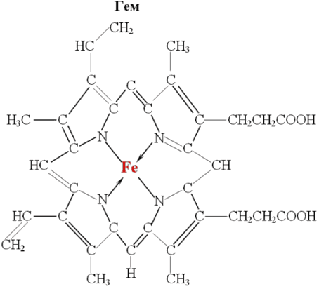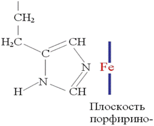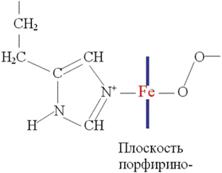 Атом железа может образовать шесть координационных связей. Четыре связи направлены к атомам азота пиррольных колец, оставшееся две связи – перпендикулярно к плоскости порфиринового кольца по обе его стороны. Гемы расположены вблизи поверхности белковой глобулы в специальных карманах, образованных складками полипептидных цепочек глобина. Гемоглобин при нормальном функционировании может находиться в одной из трех форм: феррогемоглобин (обычно называемый дезоксигемоглобином или просто гемоглобином), оксигемоглобин и ферригемоглобин (метгемоглобин). В ферригемоглобине железо находится в закисной форме Fe(II), одна из двух связей, перпендикулярных к плоскости порфиринового кольца, направлена к атому азота гистидинового остатка, называемого проксимальным (соседним), по другую сторону порфиринового кольца и на большем расстоянии от него находится другой гистидиновый остаток – дистальный гистидин, не связанный непосредственно с атомом железа. Взаимодействие молекулярного кислорода со свободным гемом приводит к необратимому окислению атома железа гема [Fe(II) Þ Fe(III); гем Þ гемин]. Поэтому в дезоксигемоглобине глобин предохраняет железо от окисления.
