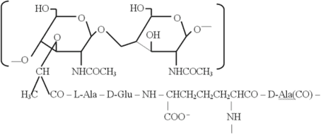 Каждая С-концевая группа этого пептида, принадлежащая остатку D-аланина, образует амидную связь с аминогруппой остатка диаминонимиелиновой кислоты, принадлежащей соседней полисахаридной цепи.