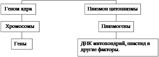 Генетического система клетки включает генотип ядра и плазмотип (плазмон) цитоплазмы. Генетический аппарат клетки дискретен. В генотипе ядра он представлен хромосомами и генами, входящими в состав хромосом, в плазмотипе цитоплазмы - плазмогенами, которые являются фрагментами пластидной и митохондриальной ДНК.