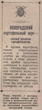 С колорадским жуком велась неустанная борьба. Частным примером тому служит и листовка, имеющая широкое распространение в пограничных областях Украины и Белоруссии в 1949-1953г.г.(рис.1)[3]