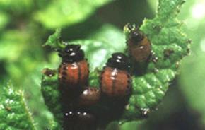 Окраска тела личинки в первом и втором возрасте темно бурая; с третьего возраста личинка становится ярко-оранжевой, розоватой или желто-оранжевой за счет накопления во время пожирания листьев картофеля пигмента каротина, неспособного перевариваться личинкой жука. И жуки и личинки колорадского жука питаются листьями пасленовых культур: картофеля, томата, баклажана, намного реже - табака. Охотно поедают и некоторые дикие растения этого же семейства. Жуки зимуют во взрослом состоянии. Весной они выходят из почвы, начинают питаться на всходах картофеля и спариваться. Если же перезимовала оплодотворенная осенью самка, то она уже через несколько дней начинает окладывать яйца.
