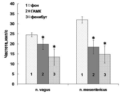 Рис. 1. Действие фенибута (10 мг/0,5 мл внутрикишечно) и ГАМК (10 мг/0,5 мл) на активность афферентных волокон блуждающего нерва. p <0,05. n =9