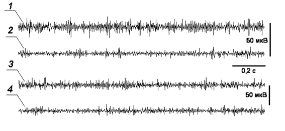 Рис. 2. Изменение частоты тонической импульсации n . vagus (1, 2) и n . mesentericus (3, 4) до (1, 3) и после (2, 4) внутрикишечного введения фенибута 10 мг/0,5 мл.