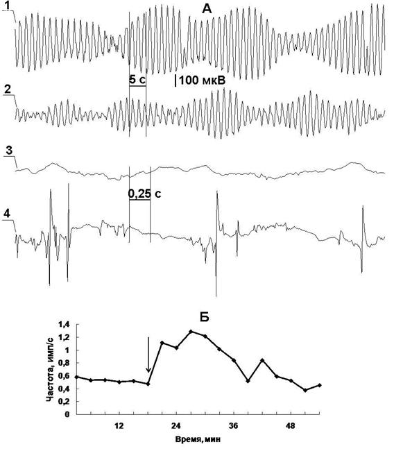 Рис. 3. Действие фенибута (10 мг/0,5 мл) на электрическую активность двенадцатиперстной кишки. А – основной электрический ритм до (1) и после (2) инъекции препарата, 3 и 4 соответственно потенциалы действия двенадцатиперстной кишки до и через 5 минут после инфузии фенибута. Б – график изменений частоты быстрых потенциалов после введения препарата.