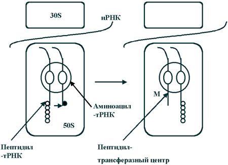 Принцип действия макролидов Антимикробное действие макролидов обусловлено нарушением синтеза белка на этапе трансляции в клетках чувствительных микроорганизмов. Молекула антибиотика способна обратимо связываться с каталитическим пептидил-трансферазным центром (P-site) рибосомальной 50S-субъединицы и вызывать отщепление комплекса пептидил-тРНК (представляющего собой растущую пептидную цепь) от рибосомы. При этом нарушается цикличность последовательного присоединения пептидной цепи к пептидил-трансферазному центру (P-site) и акцепторному аминоацил-тРНК-центру (A-site) 50S-субъединицы, то есть ингибируются реакции транслокации и транспептидации . В результате приостанавливается процесс формирования и наращивания пептидной цепи. Связывание макролидов с 50S-субъединицей возможно на любой стадии рибосомального цикла. Выявлено, что 14- и 16-членные макролиды отличаются по особенностям связывания с различными доменами пептидил-трансферазного центра.