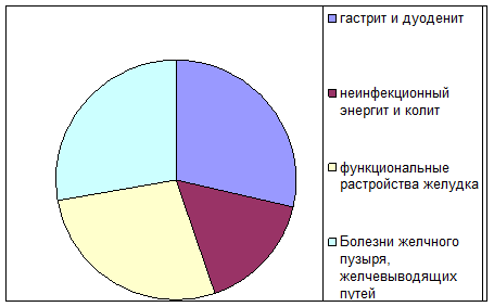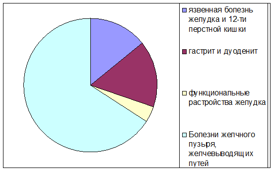 Из диаграммы видно, что в нашем районе больше болеют болезнями желчного пузыря и желчевыводящих путей. На вторичном месте гастрит, на третьем - , на пятом- болезни печени и на шестом месте болезни поджелудочной железы.