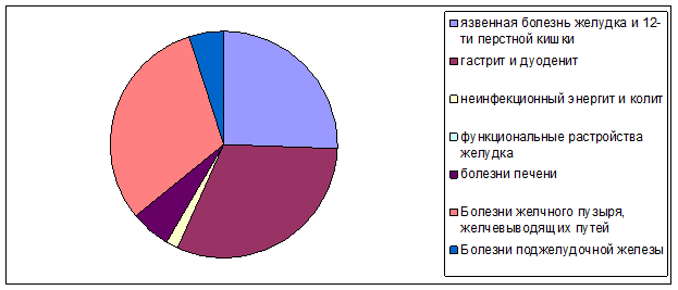 Заболевание пищеварительной системы широко распространены среди населения. Характер и частота их зависят от географических, социальных условий, исторически сложившегося образа жизни и особенностей питания, от гигиенического воспитания и культуры населения, уровня развития здравоохранения. Структуру заболеваний в Шадринском районе можно рассмотреть по диаграмме.