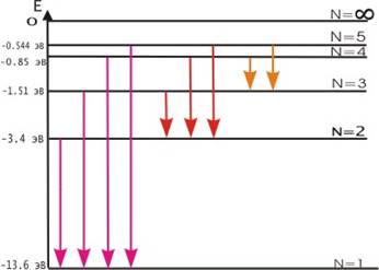 Постулаты Бора противоречат законам классической физики. Они выражают характерную особенность микромира - квантовый характер происходящих там явлений. Выводы, основанные на постулатах Бора, хорошо согласуются с экспериментом. Например, объясняют закономерности в спектре атома водорода, происхождение характеристических спектров рентгеновских лучей и т.д. На рис. 3 показана часть энергетической диаграммы стационарных состояний атома водорода.