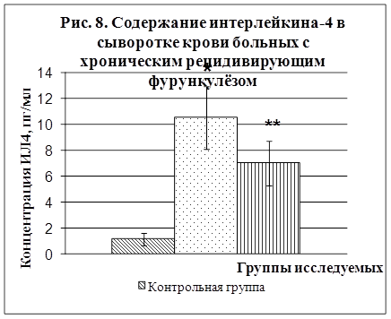 3.1.1. Результаты исследования уровня интерлейкина-4 в сыворотке крови у больных с хроническим рецидивирующим фурункулезом