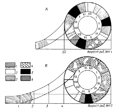У рыб одного и того же вида половозрелость может наступать в разном возрасте, в зависимости прежде всего от температуры выращивания и наличия пищи. Карп в средней полосе созревает в возрасте 4–5 лет, в южных районах – в 2 года и затем нерестует1 раз в год, в тропиках – на Кубе – в возрасте 6–9 месяцев и нерестует с полугодовым интервалом. У рыб одного вида ритм полового созревания в тропиках иной, чем в средней полосе (рис. 33). Обычно время наступления половой зрелости связано с достижением особью определённых размеров. Чем медленнее рыба растет, тем позднее созревает. Соотношение полов у разных видов изменчиво, но у большинства близко к 1: 1, кроме тех, у которых наблюдается гиногенез.